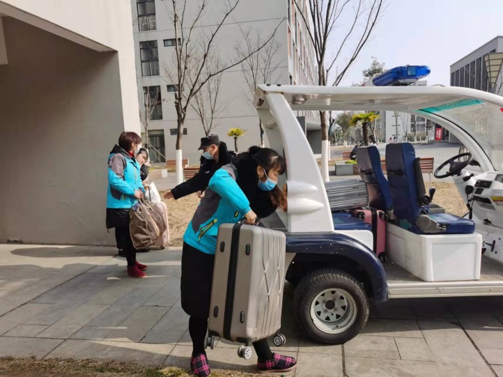 由于疫情防控需要,网约车不能入校,很多学生行李比较多,为了方便学生离校,后勤与安保处在学生公寓附近,开通“校园最后一公里”免费专车,让广大返程学子享受到从公寓到校门“专车”送达的待遇;“上车饺子下车面”,食堂精心推出特色午餐;发放免费口罩,温馨提醒学生路途做好安全防护;增加门岗执勤保安,导调校门车辆,打通堵点,铺设学生回家“通途”……