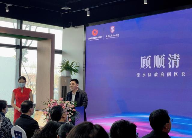下午两点,“产学研中心”开幕仪式正式开始。首先由溧水区副区长顾顺清区长致开幕词,描绘了溧水区临空示范区的发展现状和前景,高度肯定了此次校企合作的重要意义,并对“产学研中心”将带来的区域经济促进与发展给予厚望。随后我校党委书记孙朝晖书记在致辞中回顾了学校自搬迁溧水后的办学成果,着重介绍了数字财商学院在区域经济快速发展的背景下,结合临空经济产业定位,将跨境电商、直播电商、数字经济等方面与专业课程深度融合,立项建设多个市级重点项目,对此次与溧水直播电商产业基地共建“产学研中心”的未来提出目标与希望。最后,溧水直播电商产业基地负责人常成浩致辞并展示过去一年基地获得的合作成果。