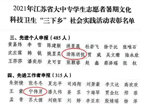 近日,中共江苏省委宣传部、江苏省文明办、江苏省教育厅、共青团江苏省委和江苏省学生联合会联合发布《关于公布2021年全省大中专学生志愿者暑期文化科技卫生“三下乡”社会实践活动先进集体和个人名单的通知》,我校“‘青’情相伴 助力前行”暑期社会实践服务队荣获“2021年全省大中专学生志愿者暑期文化科技卫生‘三下乡’社会实践优秀团队”;汤陈玥悦同学荣获“2021年全省大中专学生志愿者暑期文化科技卫生‘三下乡’社会实践先进个人”称号;宁伟男同志荣获“2021年全省大中专学生志愿者暑期文化科技卫生‘三下乡’社会实践先进工作者”称号。