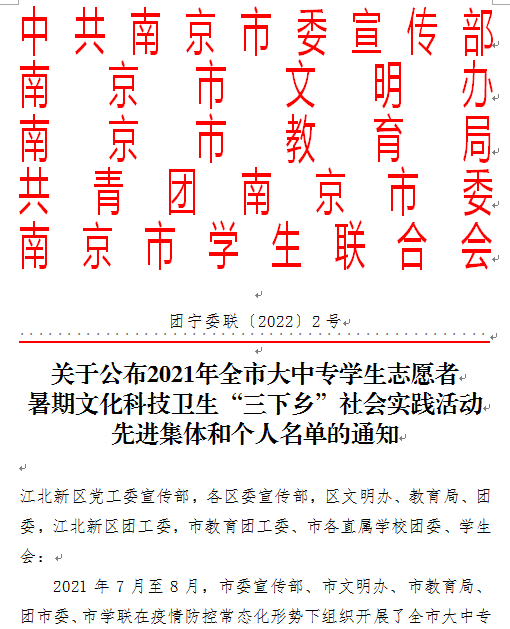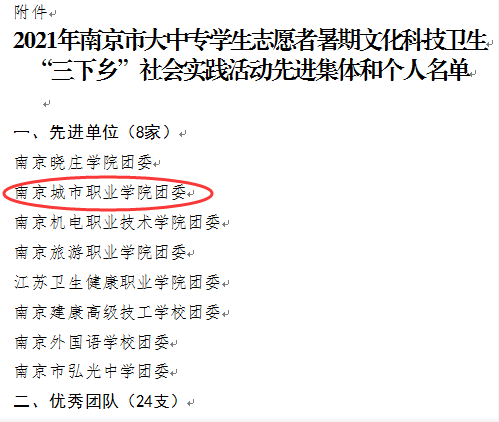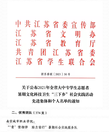 中共南京市委宣传部、南京市文明办、南京市教育局、共青团南京市委和南京市学生联合会联合发布《关于公布2021年全市大中专学生志愿者暑期文化科技卫生“三下乡”社会实践活动先进集体和个人名单的通知》,南京城市职业学院团委荣获先进单位,我校红心向党,群策之“溧”暑期社会实践志愿服务队、“红色筑梦 知行致远”暑期社会实践服务队荣获“2021年全市大中专学生志愿者暑期文化科技卫生‘三下乡’社会实践优秀团队”;张奇、田盈同学荣获“2021年全市大中专学生志愿者暑期文化科技卫生‘三下乡’社会实践先进个人”称号;陈凤娇同志荣获“2021年全市大中专学生志愿者暑期文化科技卫生‘三下乡’社会实践先进工作者”称号。