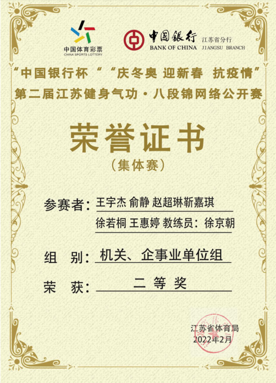 近日,由省体育局主办的“中国银行杯”“庆冬奥 迎新春 抗疫情”第二届江苏健身气功·八段锦网络公开赛圆满结束。我校朝阳武术协会组成徐京朝老师担任教练员,王宇杰、俞静、赵超琳、靳嘉琪、徐若桐、王慧婷六名同学为运动员的代表队,参加了本次公开赛的集体赛,荣获机关、企事业单位组二等奖。