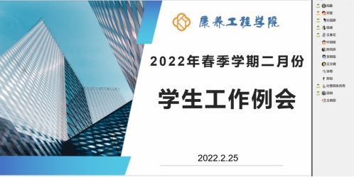 2022年 2月25日晚8点,康养工程学院召开春季学期二月份学生工作线上例会,部署近期学生工作。会议由副书记、副院长陆勤主持,全体辅导员、班主任参加了此次会议。