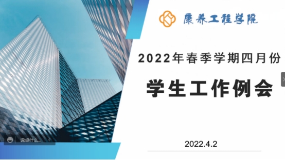 2022年 4月2日,康养工程学院召开四月份学生工作线上例会,总结三月份学生工作、部署四月份学生工作。会议由康养工程学院副书记、副院长陆勤主持,全体辅导员、班主任参加了此次会议。