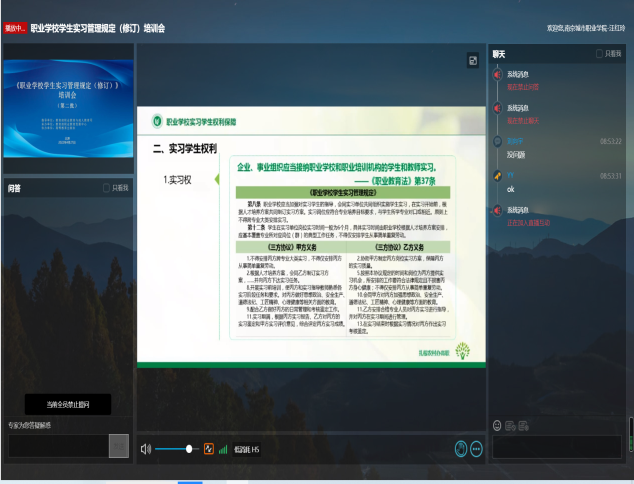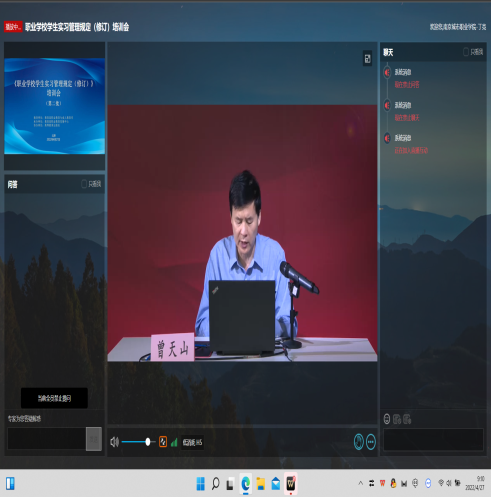 2022年4月27日上午9:00数字财商学院院领导、顶岗实习工作负责人、专业负责人、实习指导老师共33名教师以线上观看直播的方式参加了“职业学校学生实习管理规定(修订)第二批次培训”。