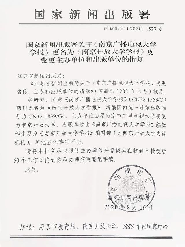 经国家新闻出版署批准,我校主办的《南京广播电视大学学报》自2022年第1期起更名为《南京开放大学学报》,新编国内统一连续出版物号为CN32-1899/G4。
