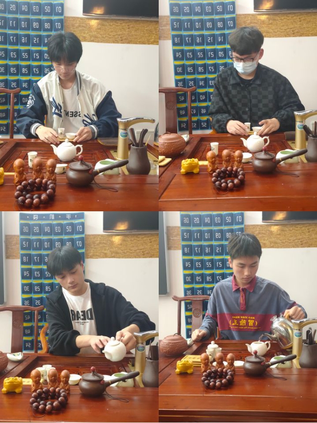 四点半,茶艺表演开始。茶艺表演是以比赛的形式呈现给大家,同学们踊跃报名比赛,表演出形式各异的泡茶技能,黄老师在旁边做技能指导。在经过两个多小时的比拼以后,最终确定了一等奖两名,二等奖三名,三等奖五名,以及优秀奖若干名。这一环节中现场讨论热烈,技能比拼激烈,推动了现场活动达到高潮。