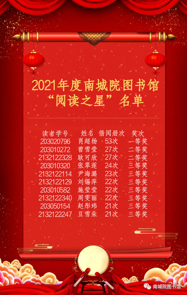 南城院图书馆第十七届读书节 2021年度“阅读之星“榜单出炉,你上榜了吗?