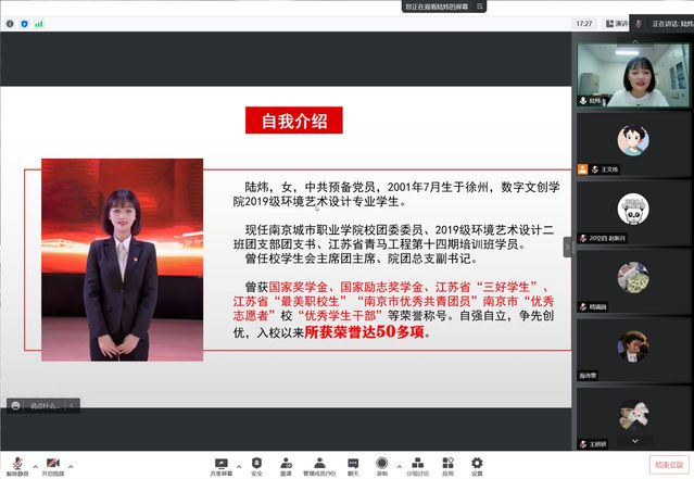 陆炜,女,数字文创学院2019级环境艺术设计专业2班学生,在校期间获2019-2020学年国家励志奖学金、2020年 “国家奖学金”、江苏省2020-2021年度“三好学生”、江苏省 2020年“最美职校生”、南京市2020年 “优秀共青团员”等50多项校级以上荣誉,2019-2020学年及2020-2021学年学习成绩、综合素质测评均年级第一、专业第一。陆炜同学在大三期间选择了留校实习,并且凭借优异的表现获得了学校和老师们的高度肯定和赞扬。本次分享交流会上,陆炜作为优秀学生代表,结合自己在南城的三年学习、生活经历,与文创的学弟、学妹们分享交流了如何不断发掘自身潜力和能力、提升完善自己的一些经验和想法,耐心解答了同学们提出的各种问题,并为他们今后的学习与生活提供了诸多建议。