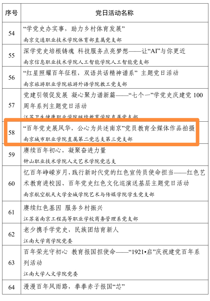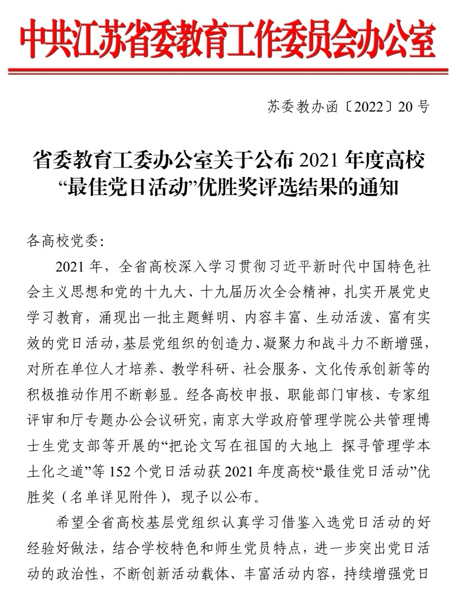 近日,从江苏省委教育工委传来喜讯,直属第二党总支第三党支部开展的“百年党史展风华,公心为共述南京”党员教育全媒体作品拍摄党日活动荣获2021年度江苏高校“最佳党日活动”优胜奖。经过各高校党委推荐、专家组评审和厅专题办公会研究,全省共有152个党日活动获此殊荣,我校党日活动排名58位。这是直属第二党总支第三党支部获评2021年度南京市先进党支部、入选全省首批党建工作样板支部培育建设单位后,在校党委坚强领导下迎来的又一发展契机。