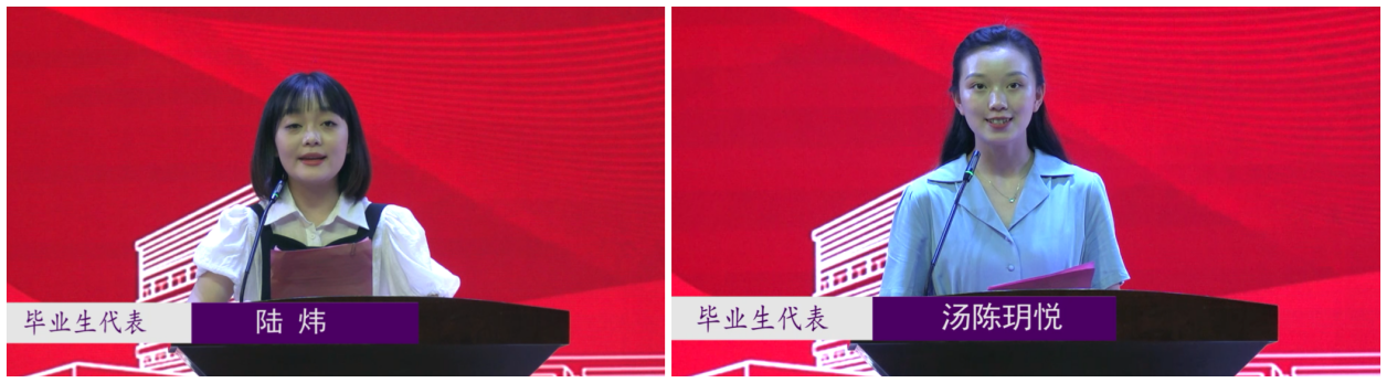 在毕业生代表发言环节,数字文创学院陆炜、康养工程学院汤陈玥悦两位同学回首三载求学路,感恩母校良好的育人氛围,感恩老师孜孜不倦的教诲,表达将怀着母校的期望和嘱托,在未来的人生道路上展示南京城市职业学院学子的靓丽风采,为母校争光。