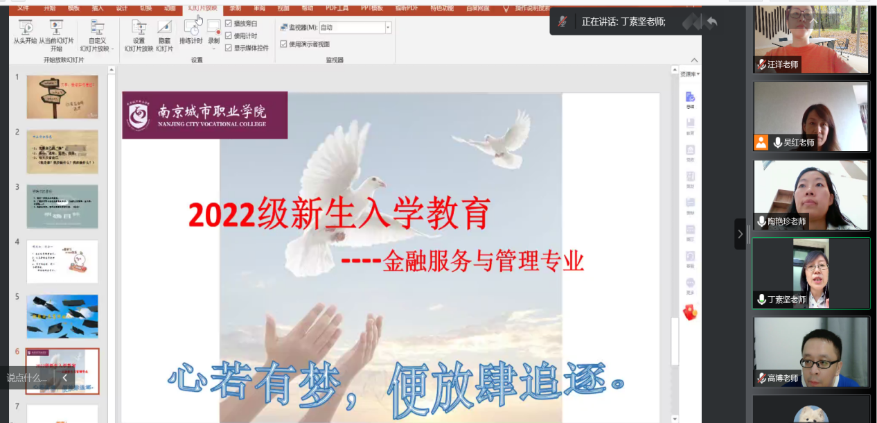 本次新生入学教育由专业负责人吴红老师主持,副教授汪洋老师主讲。新生们在汪老师和风细雨的讲解下,很快就产生了对学院及专业学习的期盼和热爱,并积极参与线上各项互动。教研室其他专业老师与新生进行了视频连线,纷纷表达了对新生们的关怀与期盼,希望大家积极适应新环境,共同度过三年美好的大学生活。此次新生线上入学教育持续了2个多小时。