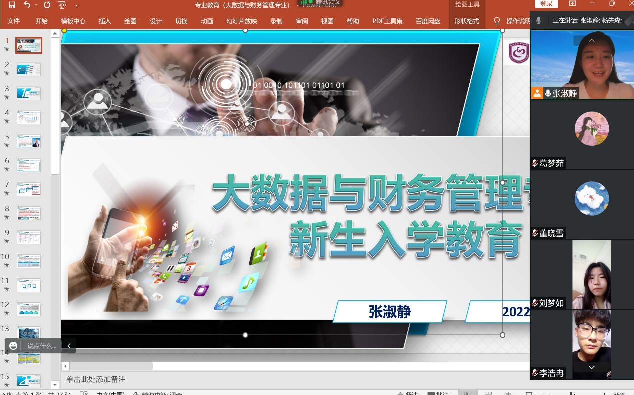 虽未谋面,但已入心。为了帮助新生对大数据与财务管理专业有更全面的了解,为学生的全面发展奠定基础,2022年9月17日下午,数字财商学院财会金融教研室精心准备,并通过腾讯会议开展了大数据与财务管理专业线上新生入学专业教育,财会金融教研室主任潘蓓老师、唐青玉老师和张淑静老师以及2022级大数据与财务管理专业全体新生参加了本次专业教育活动。