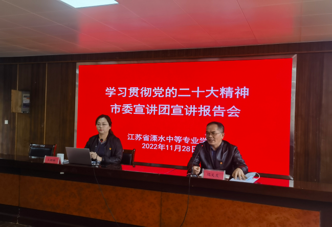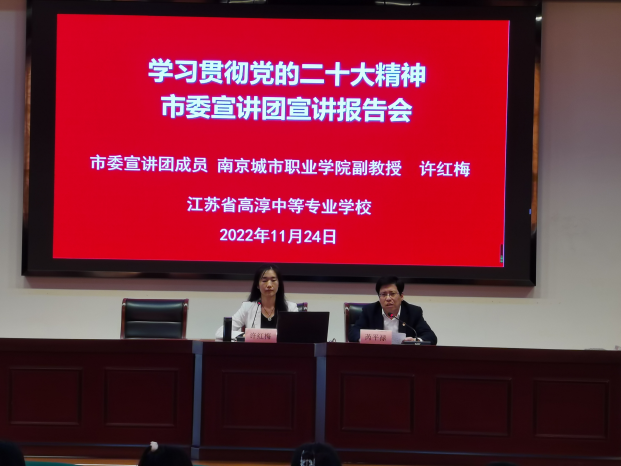 11月24日下午,学习贯彻党的二十大精神市委宣讲团在江苏省高淳中等专业学校开讲,许红梅副教授在该校作首场宣讲。许红梅副教授围绕深刻认识党的二十大主题及主要成果、过去5年的工作和新时代10年的伟大变革、深刻把握马克思主义中国化时代化等六个方面对党的二十大精神进行了深入阐释。