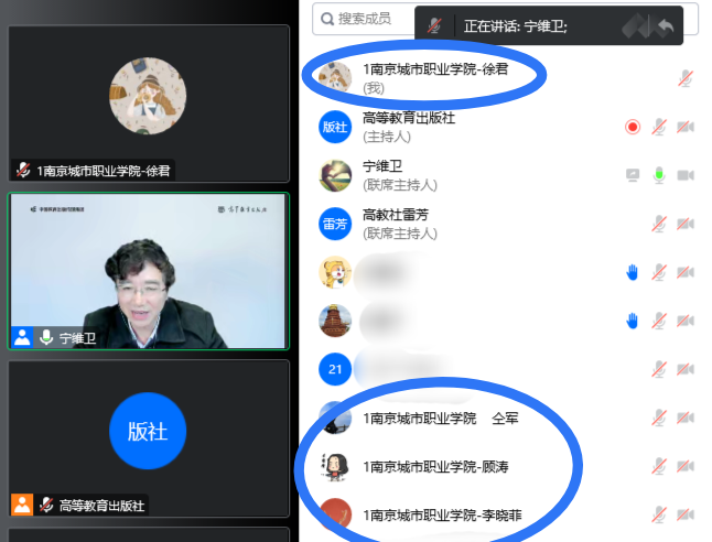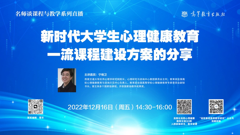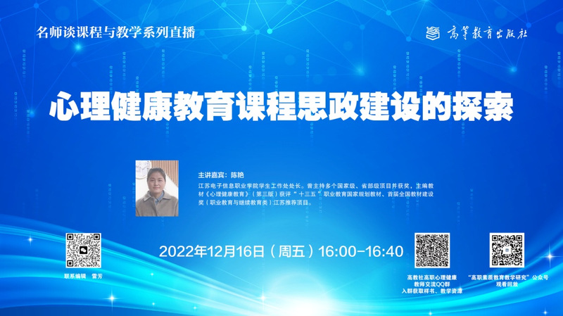 两场线上专家报告分别是:西南交通大学应用心理学研究院院长、教育部全国高等学校心理健康教育专家委员会副秘书长宁维卫教授主讲的“新时代大学生心理健康教育一流课程建设方案的分享”,以及江苏电子信息职业学院学工处处长陈艳教授主讲的“心理健康教育课程思政建设的探索”。陈教授主编的教材《心理健康教育》(第三版)获评“十三五”职业教育国家规划教材,入选首届全国教材建设奖(职业教育与继续教育类)江苏推荐项目。我校近两年来选用的教材正是由陈艳教授主编规划教材,对于课程教学团队而言,本场线上培训极具针对性,富有研讨性。
