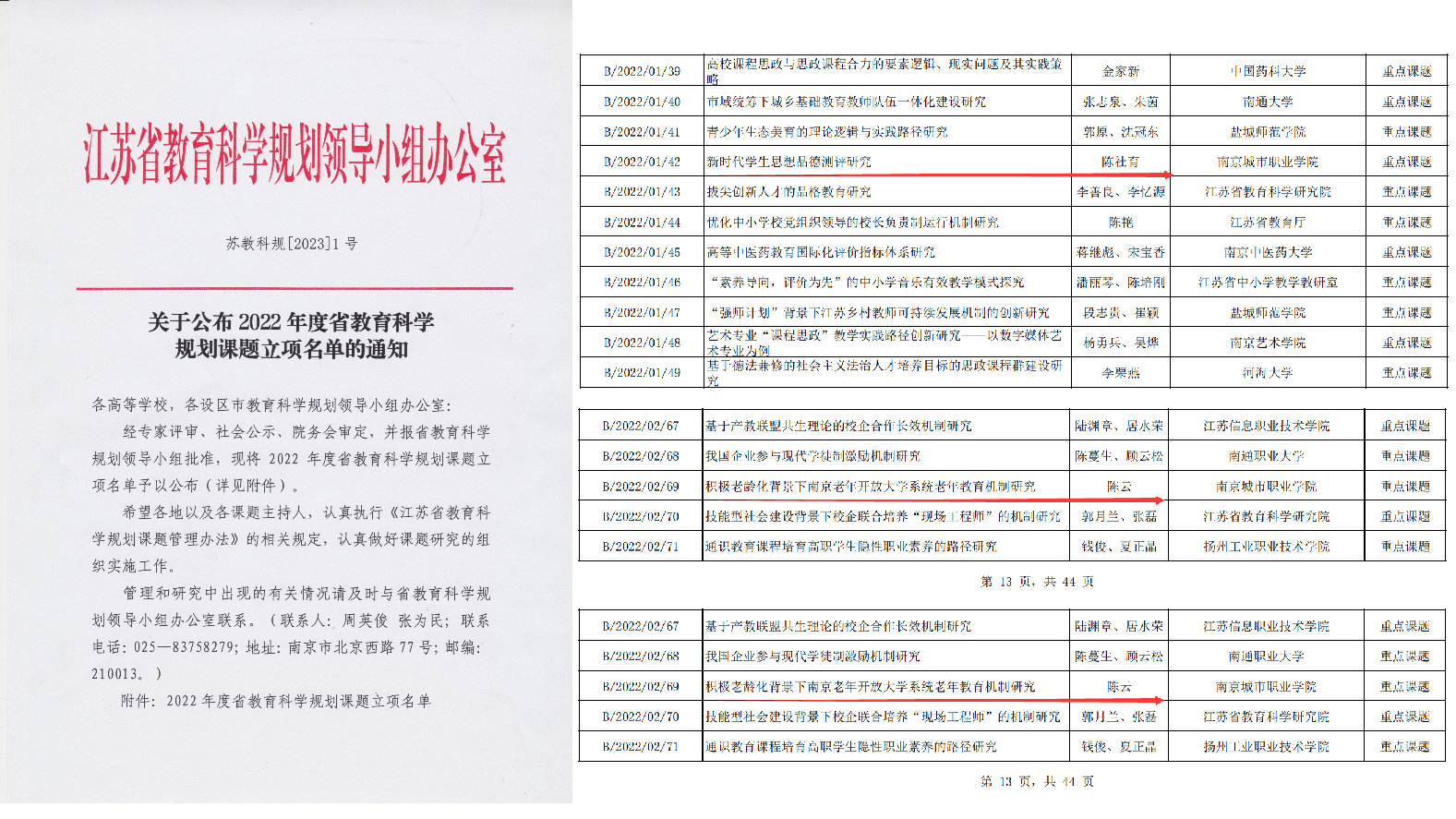 近日,江苏省教育科学规划领导小组办公室公布了2022年度省教育科学规划课题立项名单,我校陈社育校长申报的《新时代学生思想品德测评研究》被立项为“高校重点课题”,社会教育中心副处长陈云申报的《积极老龄化背景下南京老年开放大学系统老年教育机制研究》被立项为“高职中职重点课题”,公共教学部万雅莹老师申报的《面向计算思维培养的信息技术课程PBL教学模式研究》被立项为“高校青年专项课题”。
