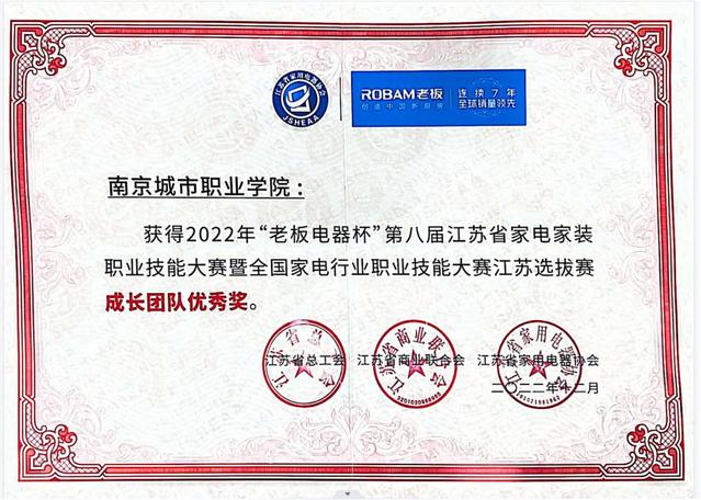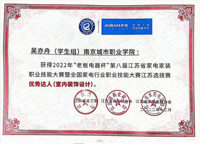 近日,“老板电器杯”第八届江苏省家电家装职业技能大赛落下帷幕,我校数字文创学院教师肖一倩、陈婧指导的6名同学在室内装饰设计项目中获得佳绩,其中三等奖1名,优秀新苗奖5名,学院获“成长团队优秀奖”。
