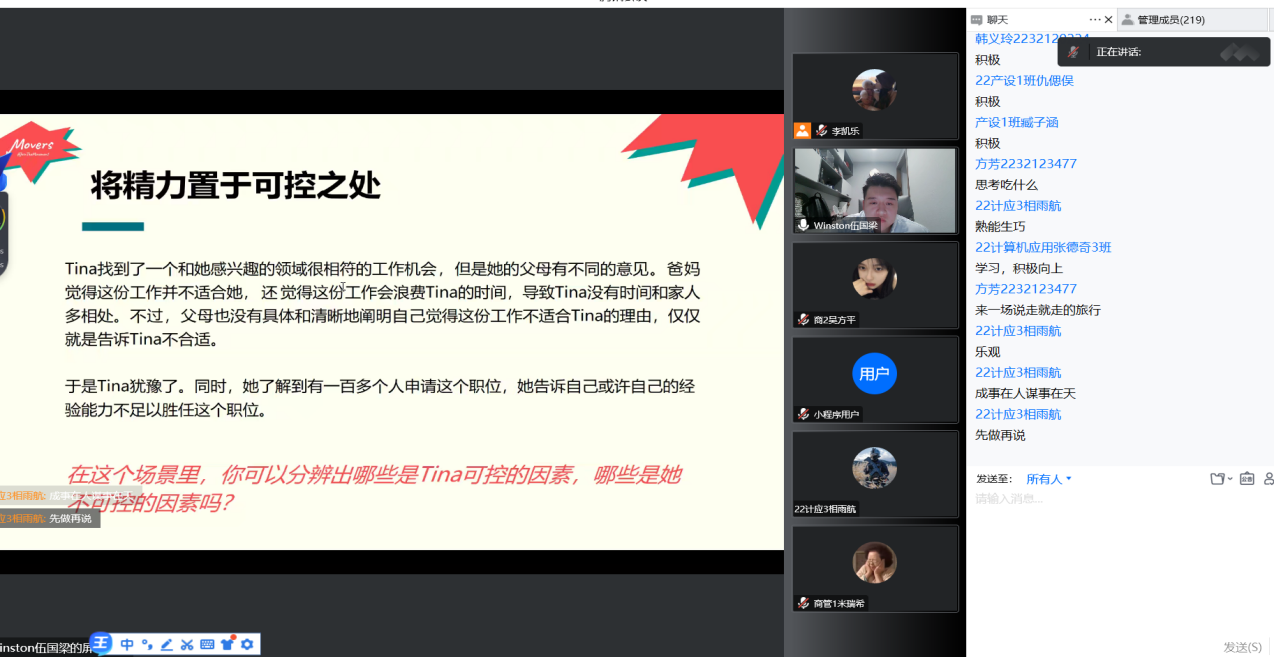本次讲座内容由学校“互联网营销技能大师工作室”推荐的“movers挖掘你的领导力探索工作坊”开展,可持续发展movers项目是联合国开发计划署官方亚太区域可持续发展倡导项目,联合国开发计划署驻华代表携手中国宋庆龄青少年科技文化交流中心,联合国志愿人员组织共同发起movers中国计划。Movers中国计划旨在设计并开展工作坊,培养青少年可持续发展意识,创业思维,志愿精神和适应21世纪生存的新技能,为社会可持续发展贡献创新解决方案。本次讲座由该项目讲师团成员伍国梁老师主讲,面向全校学生开展,探索如何挖掘自身领导力。线上讲座过程中同学们积极参与讨论,争相对伍老师提出的互动问题踊跃表达个人的见解与看法,气氛十分活跃。
