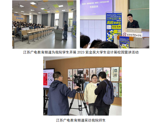 2023年4月17日,江苏广电教育频道走进校园,面向我院2021级学生开展主题为“紫金奖·第四届中国(南京)大学生设计展”的校园宣讲。同时,我院教师和部分2021级获奖学生分别从作品创意、完成过程、参赛经验等方面接受记者专访。师生纷纷表示,紫金奖大学生设计展是师生十分重视的展赛平台,是展现自我、锻炼技能、交流推广的舞台。