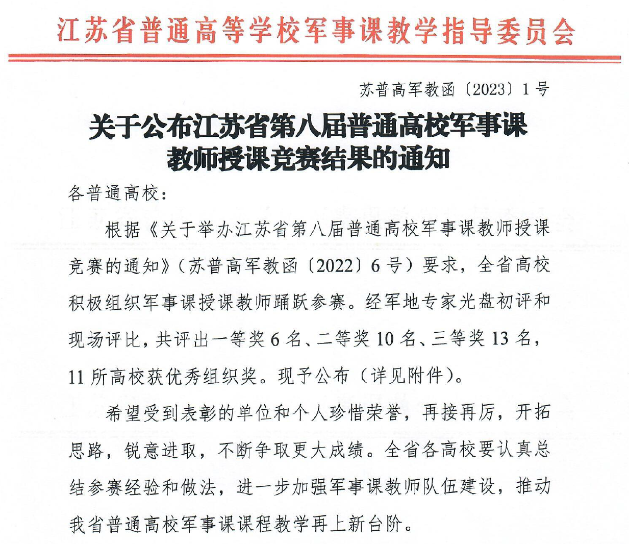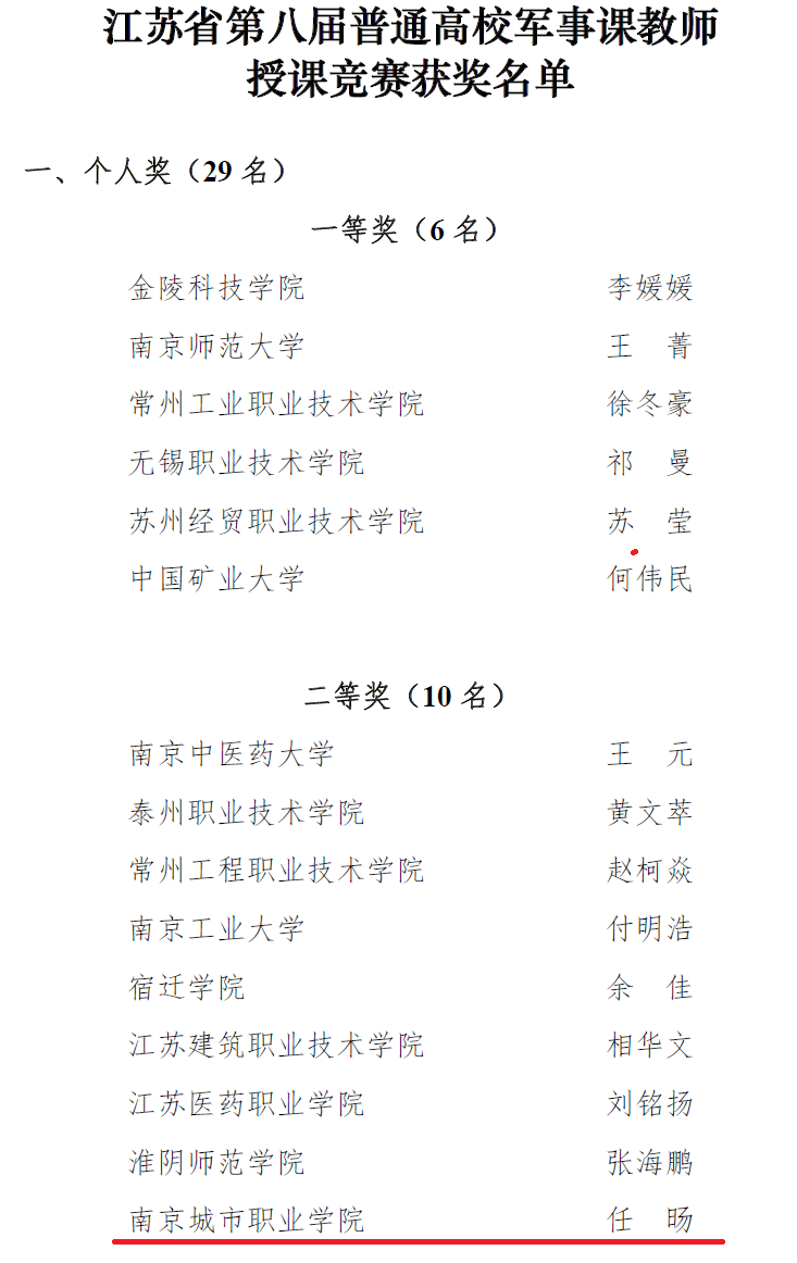 2月23日至26日,江苏省教育厅主办、江苏省普通高等学校军事课教学指导委员会承办的我省第八届普通高校军事课教师授课竞赛决赛在南京师范大学仙林校区举办。日前,江苏省普通高等学校军事课教学指导委员会下发《关于公布江苏省第八届普通高校军事课教师授课竞赛结果的通知》(苏普高军教函[2023]1号),我校公共教学部青年教师任旸取得二等奖佳绩。