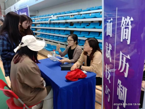 为给学生提供科学的政策指导和贴心的就业服务,本次招聘会划专区设置了政策咨询与就业指导服务台。在直属第二党总支第一党支部招生就业处大力支持下,直属第二党总支第三党支部统一战线,职业素养教研室主任褚红征老师积极谋划,支部选派创新创业导师莫晓苏和职业素养教研室“职业发展与就业指导”课程负责人吴璇两位老师现场提供简历制作和面试技巧方面的专业指导。