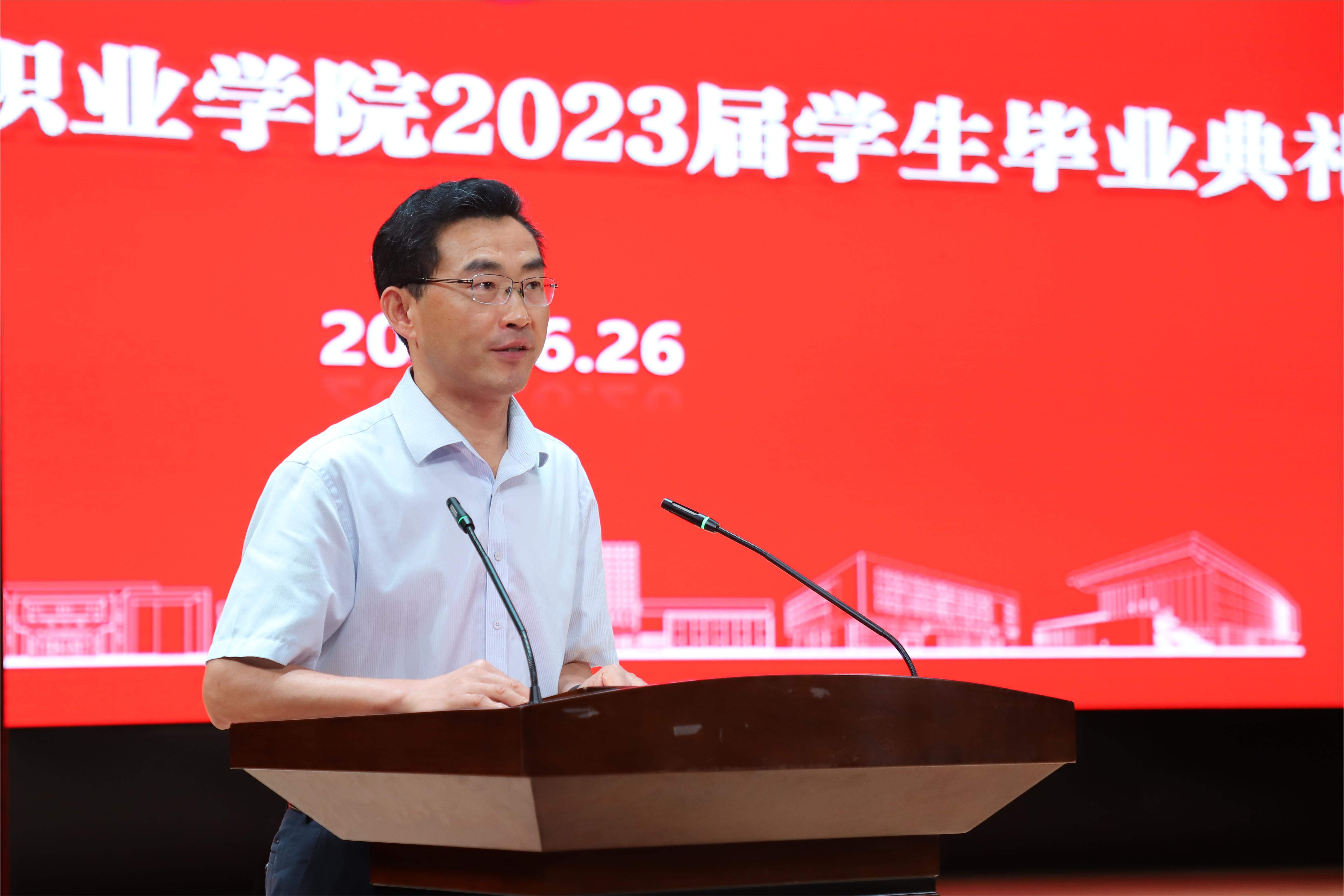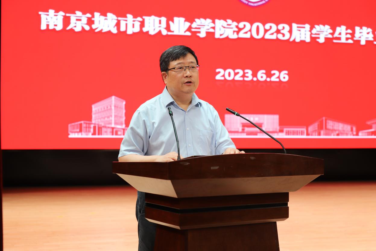 6月26日,我校在溧水校区大礼堂隆重举行2023届学生毕业典礼,校党委副书记、校长陈社育,党委委员、纪委书记周康,党委委员、副校长江景,副校长陈正宇,党委委员、组织人事部部长葛静,党委委员、宣传部部长朱小蔚,党委委员、智能工程学院党总支书记、院长力志,相关职能部门的领导、各二级学院党政负责人、教师代表和辅导员老师及毕业生代表出席典礼。校党委副书记史献平主持典礼。