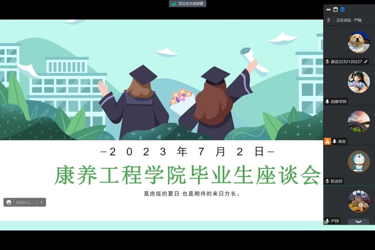 2023年7月2日晚上8点,康养工程学院线上召开毕业生座谈会。学工处处长严翔、康养工程学院副院长周康、毕业班辅导员代表、10名2023届毕业生及在校生代表加了此次座谈会,座谈会由周康副院长主持。
