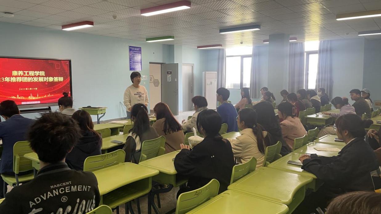 为进一步规范团员发展流程,深入推进全面从严治团,4月10日中午12点,康养工程学院团总支在敬业楼301教室召开2023年团员发展对象答辩会。学院副书记、副院长陆勤,校团委副书记柴黄洋子、院团总支书记叶俏瑜,辅导员王林以及35位团员发展对象候选人参加了此次答辩。