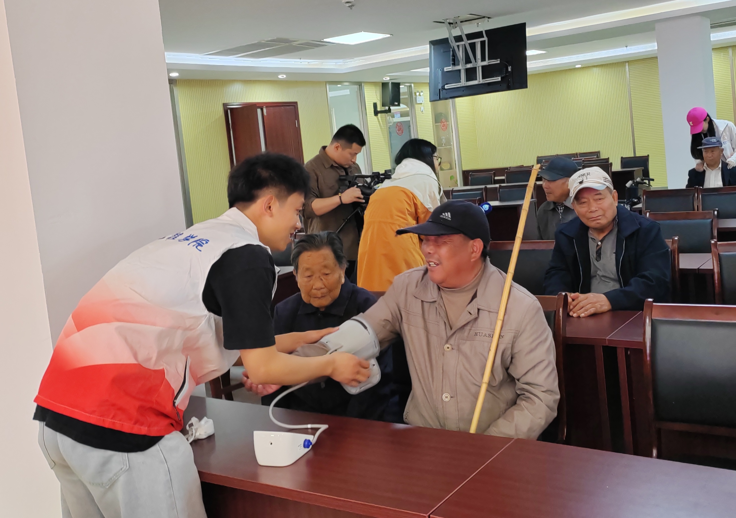 最后,志愿服务小分队走到盲人和老人身边,为他们测血氧、测血压、按摩。志愿者耐心地进行了解答并按照不同的身体状况给予建议,不少盲人拉住志愿者的手表达谢意。