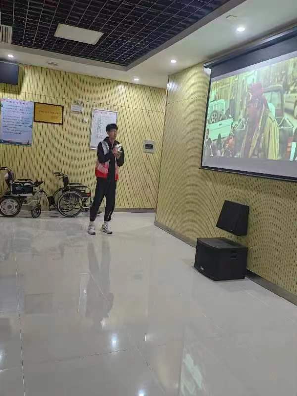 此次活动由康养工程学院“城智康健”助老助残小分队的左武益同学带队,黎玉洁、刘雨、陈长新、魏杰、徐志远、韩昊宇共七名成员组成。本次讲述的电影是由我国在利比亚撤侨行动真实故事改编而来的《万里征途》。每名志愿者各有分工,分别负责不同的片段,同学们铿锵有力,富有激情的解说伴随着电影故事进行的声音传递到老人们的耳中,现场的老人们和盲人们的脸上都出笑容,他们的表情仿佛在告诉我,他们真的“看到了”。参与志愿服务的同学也感到了自身的意义所在,更加激发了同学们对志愿服务的热情。