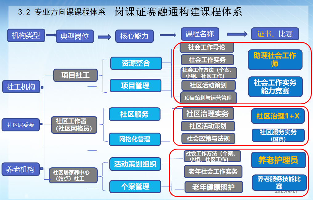学校2006年设置社区管理与服务专业,当年是南京地区最早设置该专业的院校。该专业在17年间经历了发展初期、提升期、调整期和迭代期等四个阶段,丰富的专业建设实践为我院专业群其它专业的设置奠定了良好的基础。社区是居民生活场域。在社区,社区工作者(社会工作者)主要负责联动整合各类资源(养老托幼、营养配餐、康复保健等资源),为“一老一小”提供资源链接、关系改善、潜能挖掘、心理疏导、团体建设、社团辅导等专业化服务,推动社区治理体系构建和治理目标的实现,协助“完整社区”建设,这些岗位职责和相应的职业能力要求就是社区管理与服务专业在整个健康管理(社区康养)专业群的人才培养定位依据。