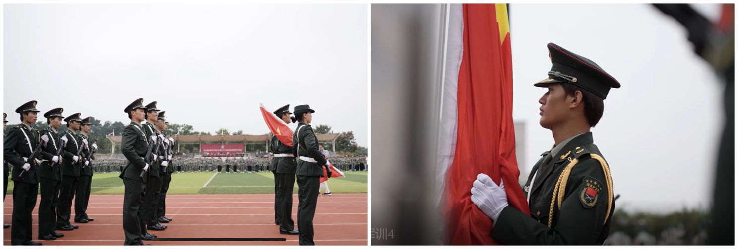 国旗护卫队英姿飒爽、步履铿锵,护送国旗入场。随着鲜艳的五星红旗冉冉升起,全场奏唱国歌,仪式正式开始。