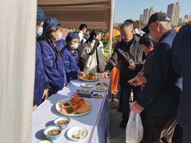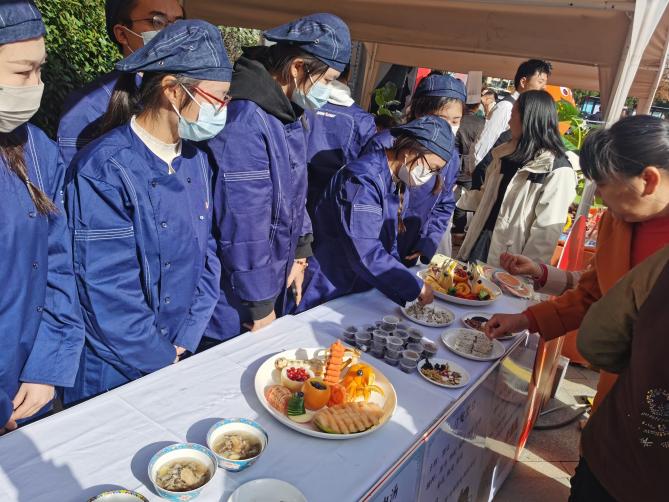 活动现场,人头攒动,络绎不绝。师生们向群众展示了花式果盘、食品雕刻、养生膳食,人们兴致盎然。对同学们制作的乌发黑豆、茯苓坚果糕、人参虫草炖鸡汤、当归干姜羊肉汤赞不绝口。很多爷爷奶奶们不仅细细品尝,还仔细询问制作方法,食材搭配,学生们有问必答,并进一步介绍原料选择、制作方法、养生功效。活动现场师生还不失时机地向群众有序发放了营养膳食宝塔冰箱贴、营养成分速查圆盘小礼品,指导人们日常如何查询使用,提升居民科学饮食观念,倡导健康饮食、平衡膳食。
