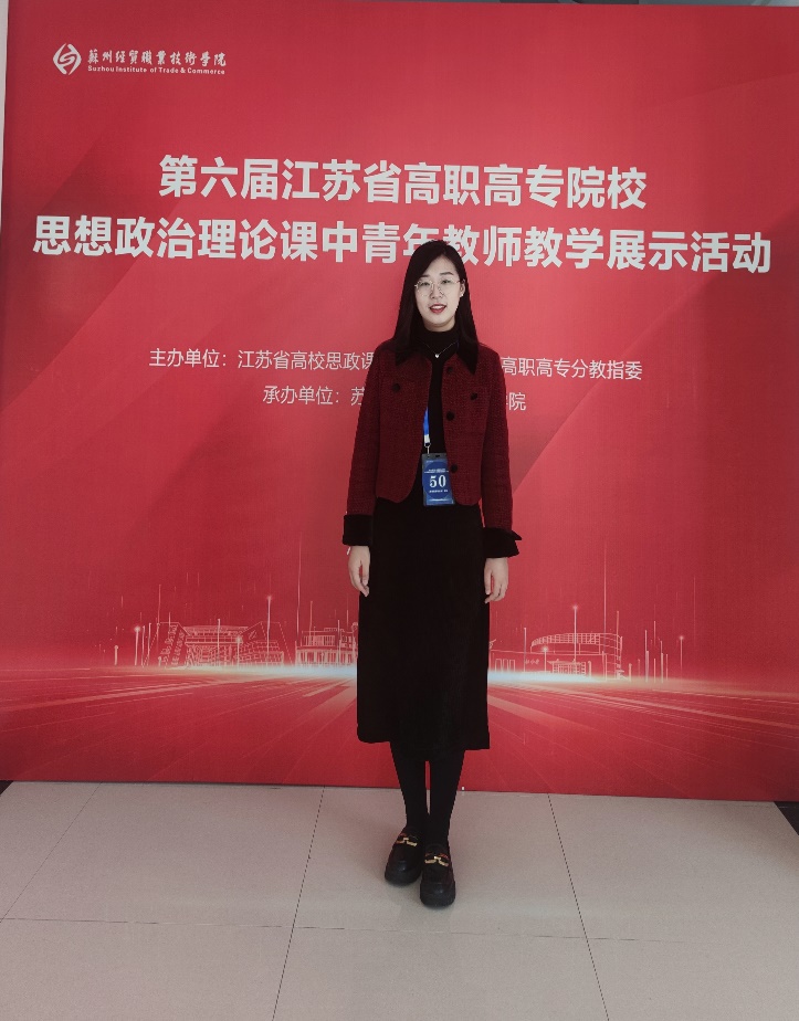 近日,第六届江苏省高职高专院校思想政治理论课中青年教师教学展示活动《思想道德与法治》《形势与政策》课程比赛在苏州经贸职业技术学院举办。经过角逐,我校马克思主义学院教师张蓉荣获《思想道德与法治》组特等奖。