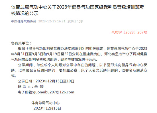 近日,国家体育总局健身气功管理中心对2023年国家级健身气功裁判员晋级培训班考核情况进行了公示。据公示信息,我校公共教学部体育教研室徐京朝老师通过了此次考核。