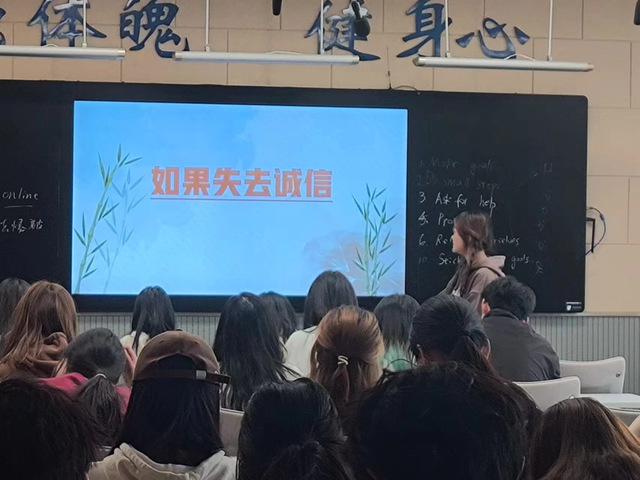 朱丽彤通过“诚信为金”为切入点,为同学介绍诚信的意义。诚信是一个道德范畴,是公民的第二个“身份证”,是日常行为的诚实和正式交流的信用统称。朱丽彤引用多个名人金句和书籍中经典词句,论述讲诚信的重要性。诚信是中华民族的传统美德,立身做人的基本规范,与人交往要讲信用、守诺言,无论是生活中,还是学习中所建立的关系与信任都是建立在诚信的基础之上。朱丽彤在最后通过毒奶粉等案例与同学们讨论了“如果丢失诚信,会怎么样”,让同学们懂得失去诚信的可怕,警示同学们不要丢失诚信,做好自查自纠。