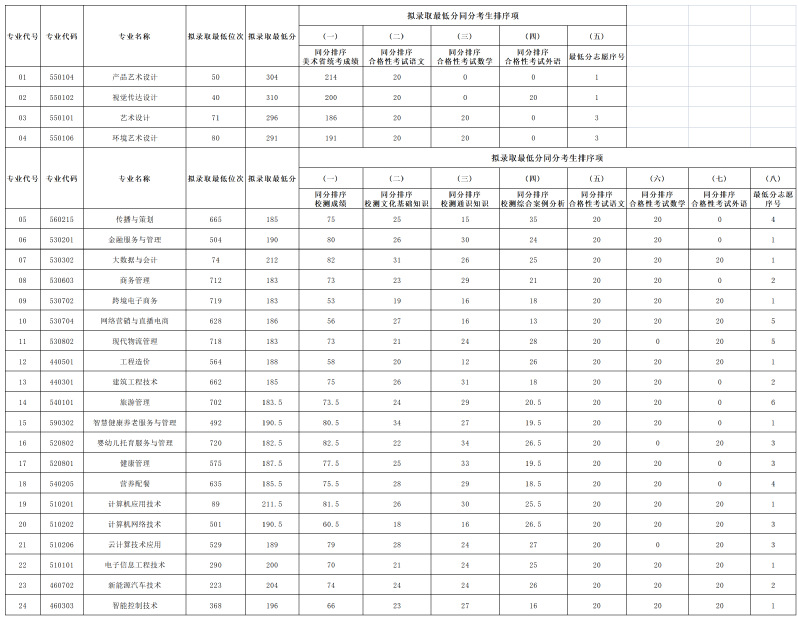 今年提前招生计划800人,录取800人,其中艺术类计划80人,录取80人,最低录取位次80名(最低录取总分291分,同分排序美术省统考成绩191分);普通类计划720人,录取720人,最低录取位次720名(最低录取总分182.5分,同分排序校测82.5分)。具体各专业投档情况如下图:
