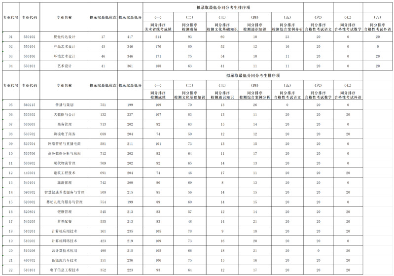 普通类考生总分若相同,按考生校测成绩、校测考核文化基础知识、通识知识、综合案例分析、合格性考试语文、合格性考试数学、合格性考试外语依次排序优先录取;如仍相同,比较考生专业志愿顺序,顺序在前者优先录取。