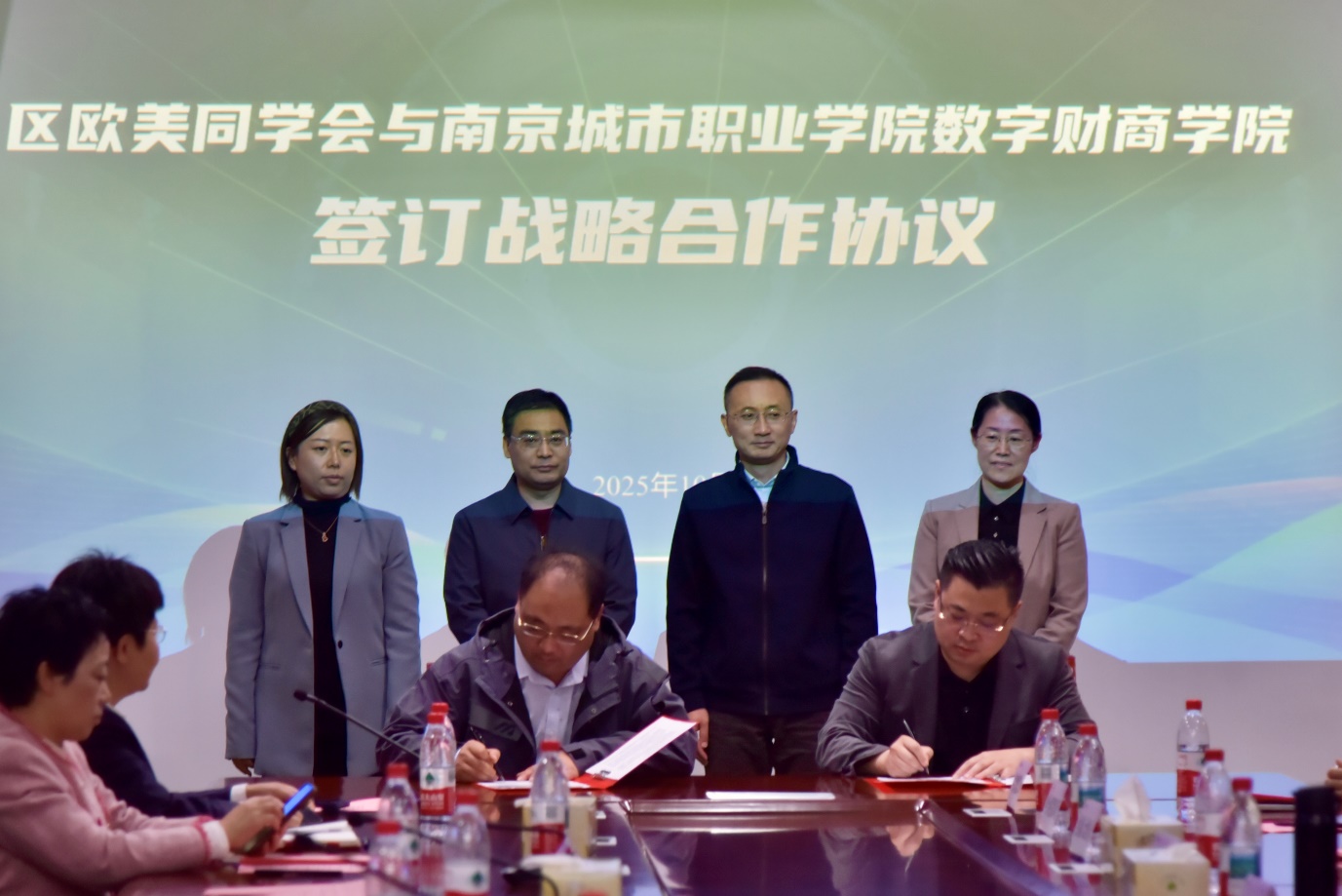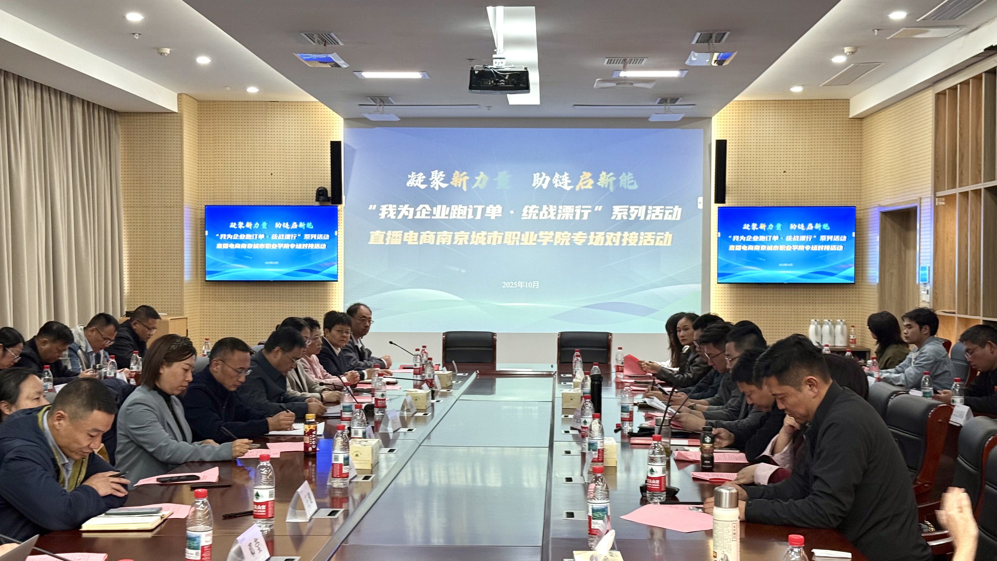 为深入服务区域经济发展,助力溧水当地企业开拓新兴市场,同时深化产教融合、协同培育符合行业需求的实战型人才,在溧水区委统战部与我校党委统战部的对接与共同指导下,10月24日下午,由溧水区欧美同学会(溧水区留学人员联谊会)与数字财商学院联合承办的“我为企业跑订单·统战溧行”直播电商专场对接活动在我校溧水校区科创楼举行。副校长陈正宇、溧水区委统战部副部长任贤俊、校党委组织部(党委统战部)部长葛静、南京市欧美同学会张婕出席会议,校教务处、发展合作处、科研处等部门主要负责人、溧水区各街道统战负责人、溧水区18家海归企业代表参加活动。