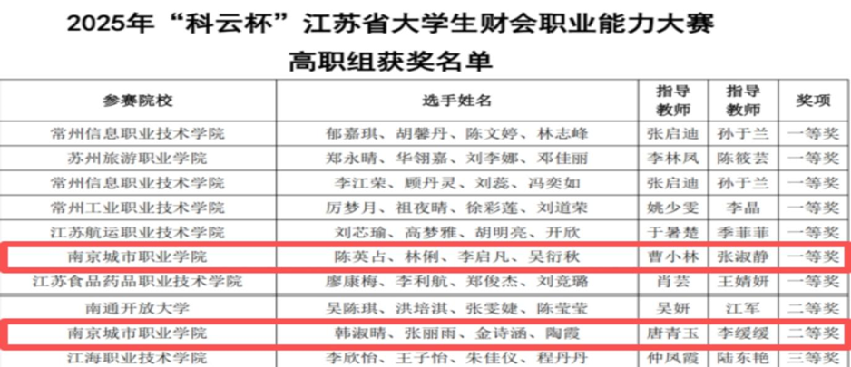 近日,2025年江苏省“科云杯”大学生财会职业能力大赛落下帷幕。我校数字财商学院精心选拔8名优秀学子组建两支参赛队伍,在全省多所院校62支队伍的激烈角逐中表现亮眼。“南城1号”蓄力而发斩获一等奖,“南城2号”稳步发挥拿下二等奖。