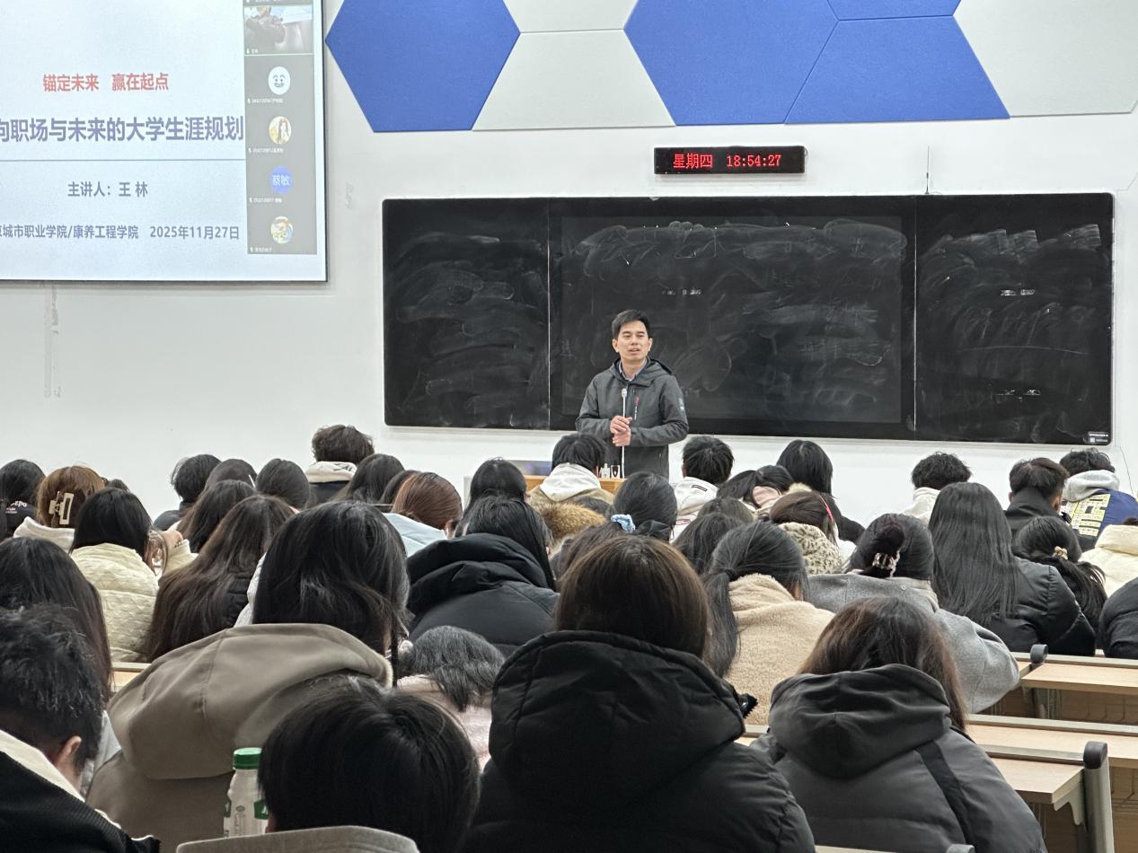 为引导2025级学生树立科学的生涯规划观念,明确学学业目标与发展方向,同时扎实推进学院学风建设,2025年11月27日,康养工程学院在敏行楼101教室开展了以“面向职场与未来的大学生涯规划”为主题的新生专题讲座。讲座由学院辅导员王林主讲,近300名新生参加讲座,现场气氛热烈。