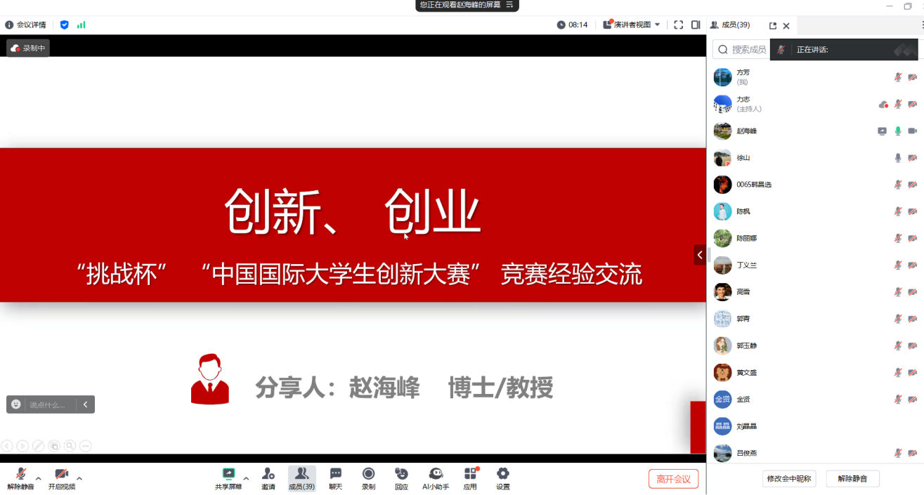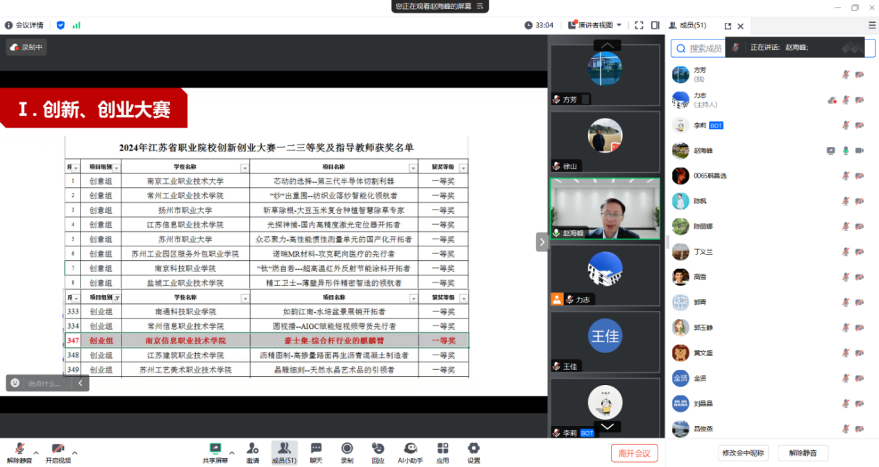 20251113日晚,智能工程学院在线上成功举办了“创新、创业大赛”专题讲座。本次讲座特邀南京信息职业技术学院赵海峰教授担任主讲,智能工程学院党总支书记、院长力志主持,学院全体教工参加。