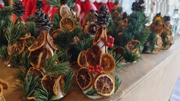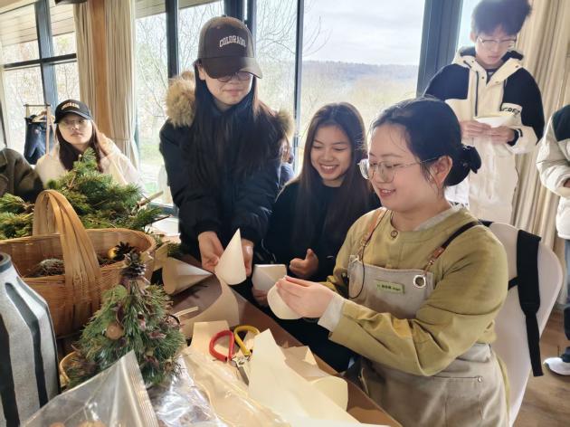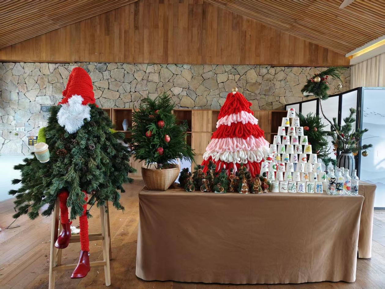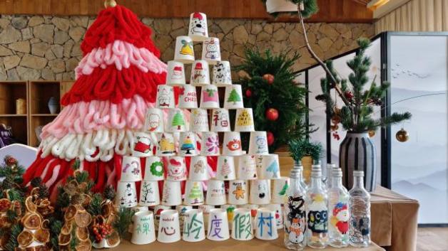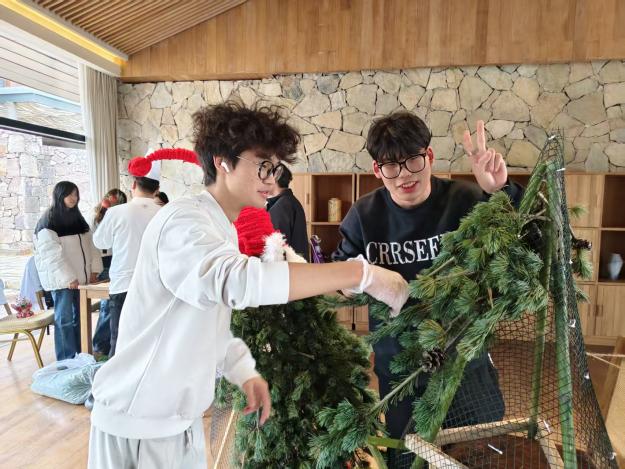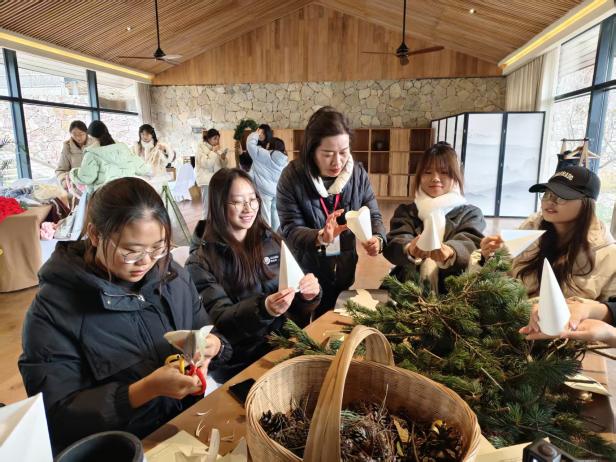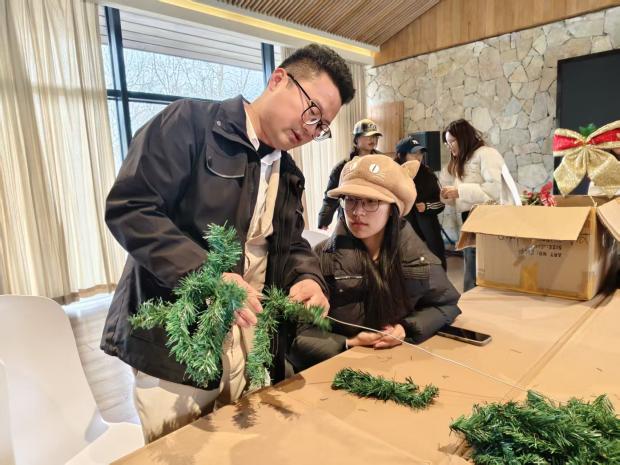 抵达裸心岭度假村后,学生按企业实际岗位需求分组,分别融入前厅组、客房组、康乐组、餐饮组、工程组等部门,在企业导师的带领下共同完成圣诞主题作品的全流程打造。针对基础材料不足问题,学生与企业导师共同寻找度假村内松枝、松果、天然石材等素材,让设计更贴合裸心岭的生态基调。现场设计与优化环节成为此次实训的核心亮点。各组围绕“森系低碳圣诞”主题展开热烈头脑风暴,将专业思考与岗位特性深度结合:前厅组以环保材料为核心,创作纸杯圣诞主题画作、酒瓶彩绘圣诞挂饰;餐饮组巧用天然素材制作迷你圣诞树,搭配圣诞主题花艺装饰;客房组以温馨为基调,用松枝、松果等天然元素点缀房间角落,营造沉浸式节庆氛围;康乐组设计毛绒圣诞树、创意圣诞老人等趣味互动装置,充分贴合客群体验需求。