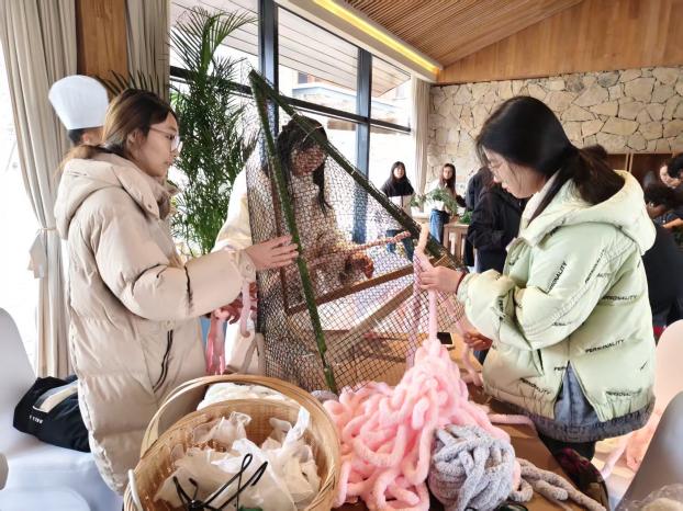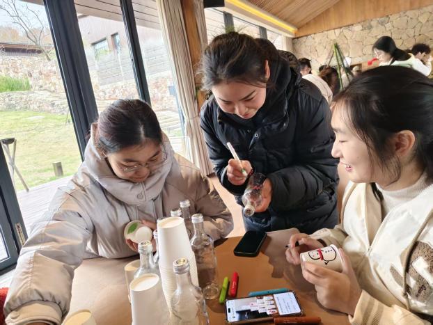 实训过程中,学生们的创意设计既深度呼应裸心岭的环保理念,又展现出年轻群体的审美视角。面对素材适配、工艺落地等实操难点,校企导师共同攻关:企业导师现场示范装饰固定、色彩搭配等专业技法;李老师则针对设计如何匹配客群需求等问题,为学生提供专业指引。学生们带着问题反复打磨方案,最终呈现的作品凭借生态感、创意感、实用性兼具的特点,赢得裸心岭度假村管理层及员工的一致好评。
