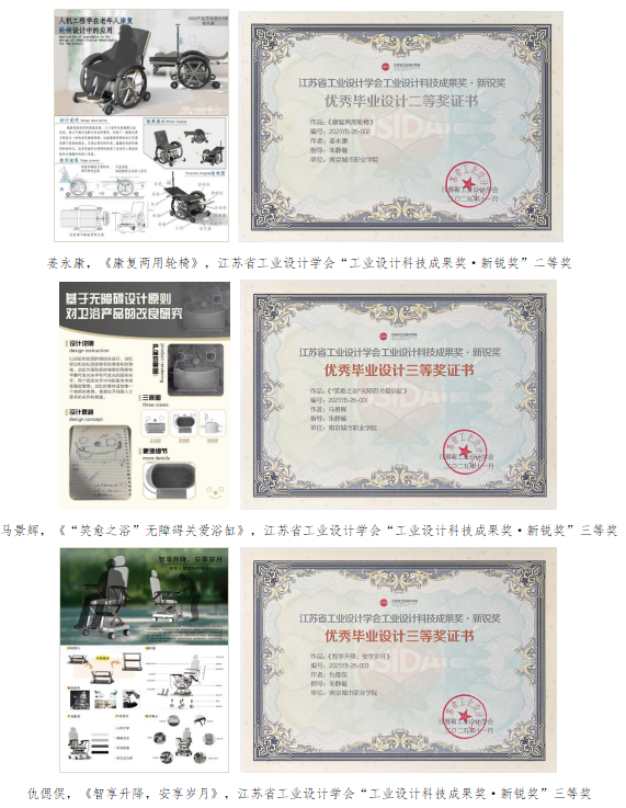 与此同时,由我院产品艺术设计专任教师朱静璇指导的2022级毕业设计作品,在江苏省工业设计学会主办的2025年优秀毕业设计奖评选中斩获佳绩。姜永康、马景辉、仇偲俣三位同学分别以作品《康复两用轮椅》《“笑愈之浴”无障碍关爱浴缸》和《智享升降,安享岁月》参赛,凭借其创新性、人文关怀与实用价值,荣获江苏省工业设计学会“工业设计科技成果奖·新锐奖”二等奖一项、三等奖两项,充分展现了我院学子扎实的专业能力、敏锐的设计思维与强烈的社会责任感。