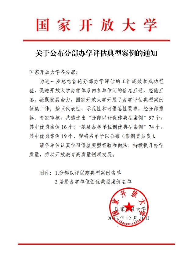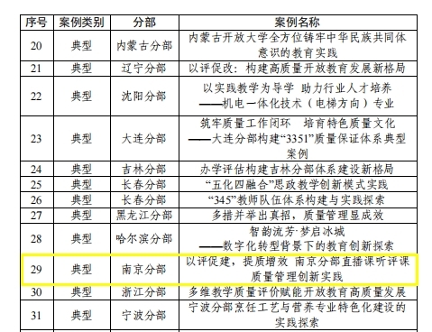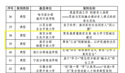 近日,国家开放大学公布了分部办学评估典型案例评选结果,我校报送的《以评促建,提质增效 南京分部直播课听评课质量管理创新实践》获评“分部以评促建典型案例”,玄武开放大学报送的《聚焦高质量教育发展 助力学习型城区建设》、栖霞开放大学报送的《聚焦“三治”创新赋能,以评促建创优实践》获评“基层办学单位创优典型案例”。
