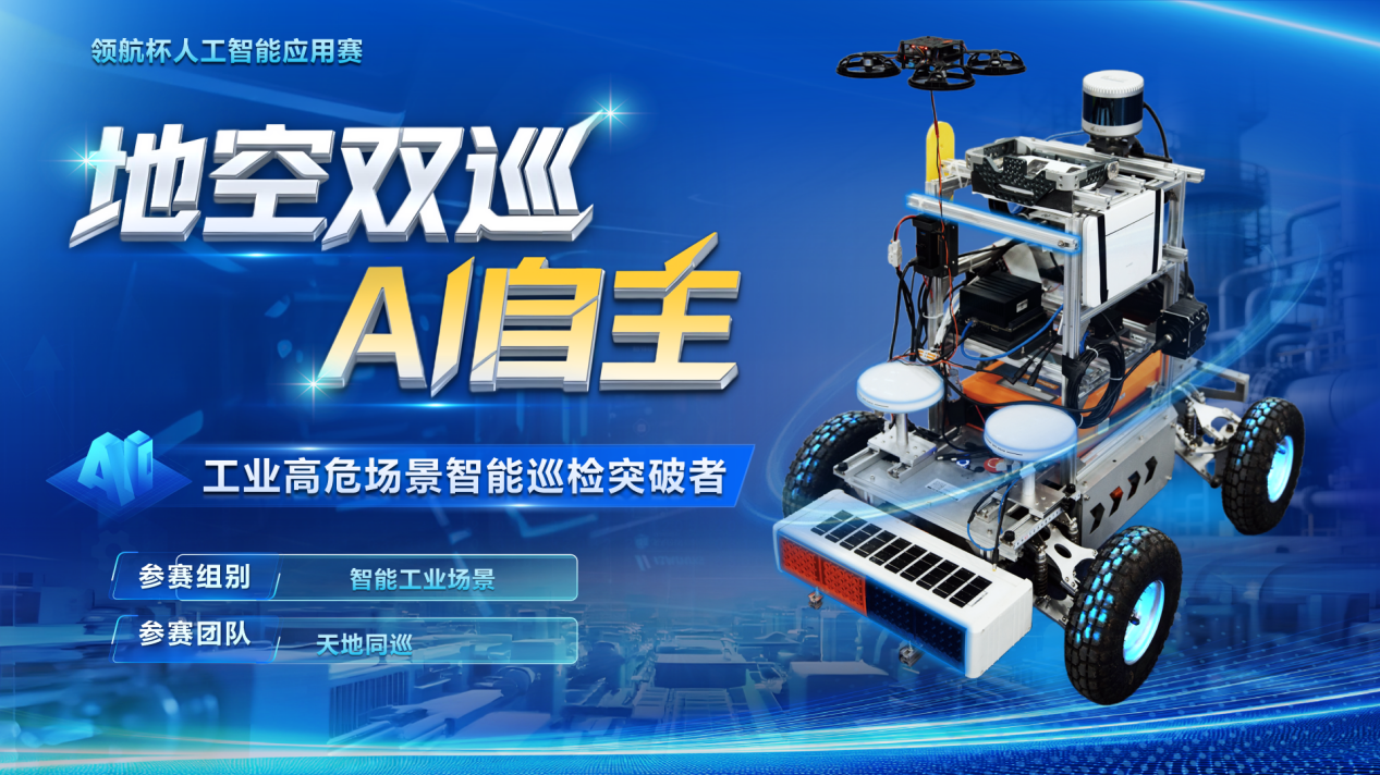 在本届大赛的人工智能应用赛项中,我校参赛团队聚焦国家战略需求与产业前沿,提交了多份兼具技术创新深度与广阔应用前景的优秀作品,亮点纷呈。其中,特等奖项目“地空双巡·AI自主”创新性地提出“轮式机器人+系留无人机”的立体巡检方案,通过多模态数据融合与智能算法,将传统高危场景的巡检效率提升了200%,缺陷识别准确率超98%,并实现硬件成本降低35%,为工业安全生产提供了切实可行的智能化解决方案。另一获奖项目“天枢六目VR驭界智车”则将动态VR技术与无人驾驶平台相结合,创建“VR实景驾驶舱”,在特种车辆培训、智慧康养等领域展现出巨大应用潜力。