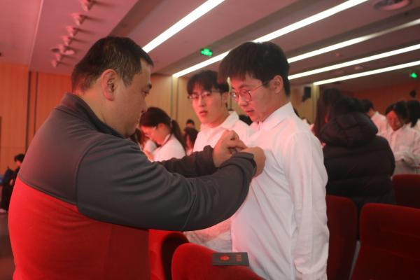 随着雄壮激昂的国歌奏响,入团仪式正式拉开帷幕。全体与会师生庄严肃立,齐声高唱国歌,现场气氛庄重而热烈。随后,主持人李娅向在场团员、团干部阐释入团仪式的深刻意义,并宣读新团员名单,向光荣加入共青团的青年学子致以热烈祝贺。在鲜艳团旗的映照下,老师们依次为新团员佩戴团徽、颁发团员证,一枚枚团徽佩戴在胸前,承载着责任与使命。