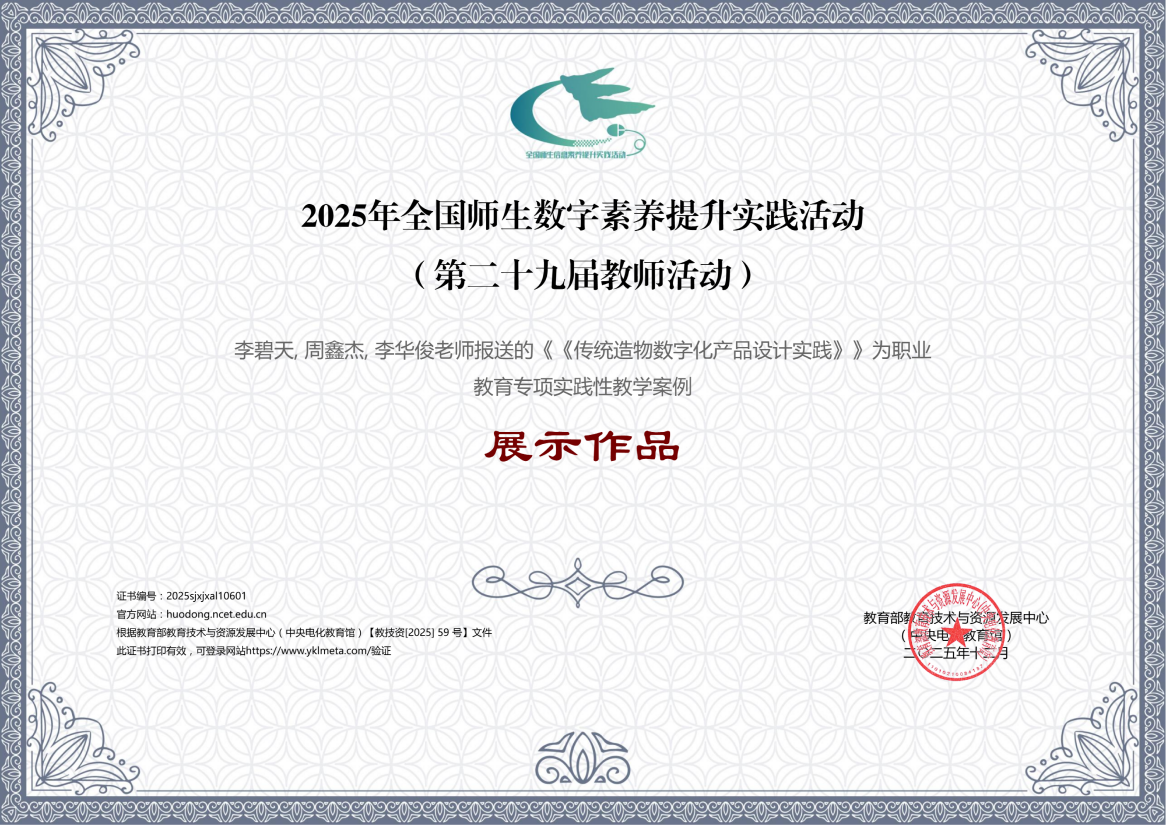 近日,由教育部教育技术与资源发展中心(中央电化教育馆)举办的2025年全国师生数字素养提升实践活动(第二十九届教师活动)结果公布,我校数字文创学院教师李碧天、周鑫杰、李华俊(技能大师)报送的职业教育专项实践性教学案例《传统造物数字化产品设计实践》获评为展示作品。