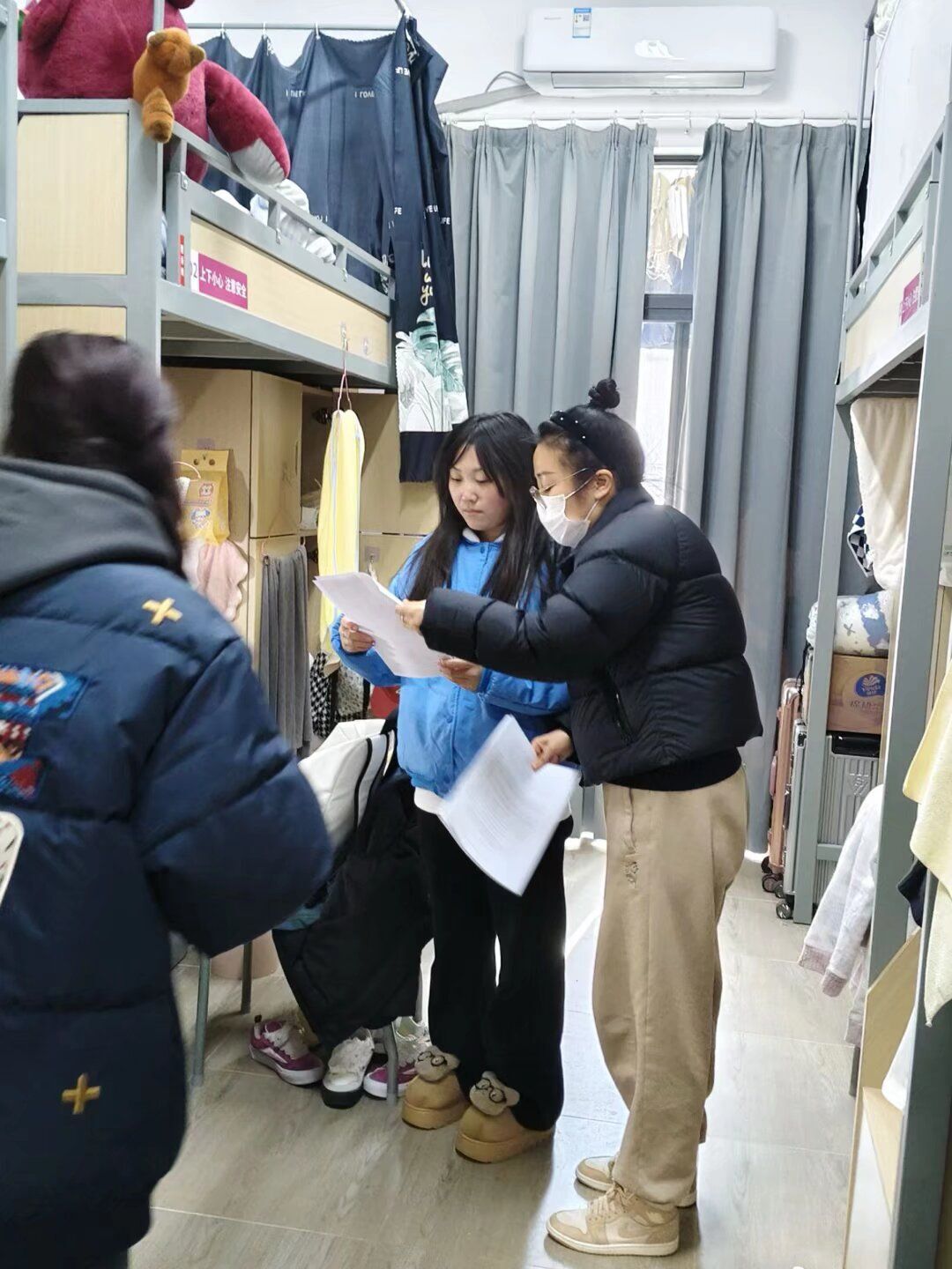 为确保学生离校前宿舍安全无隐患,辅导员深入学生公寓,逐间走访学生宿舍,实地查看用电安全、物品存放及卫生状况,叮嘱同学们离校前务必关闭电源、锁好门窗、妥善保管贵重物品,并及时清理易腐垃圾,防止安全隐患发生。在走访过程中,辅导员还与学生亲切交流,了解其返乡安排和实际困难,对家庭经济困难或存在心理困扰的学生给予重点关注和帮扶,传递学院温暖关怀。