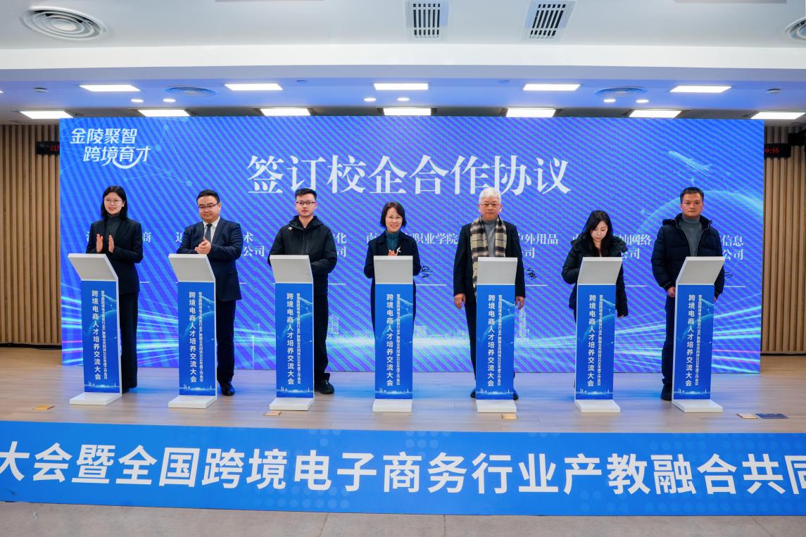 会上,南京市商务局发布了南京市跨境电商“全层级人才培育计划”,江苏省苏豪云商有限公司等六家知名跨境电商企业与我校签订校企合作协议,南京市商务局与我校签订跨境电商人才联合培养协议。与会嘉宾共同见证了南京电商人才培养基地揭牌。